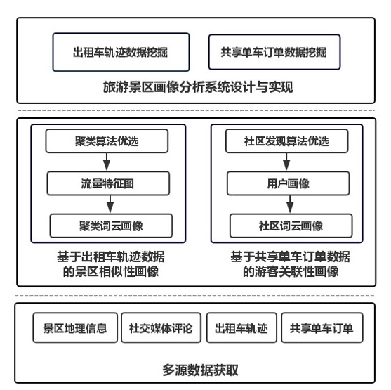 获奖论文针对智慧旅游建设过程中的景区规划和游客画像两方面内容,研究了基于网络爬虫的多源空间数据获取、基于出租车轨迹数据的景区相似性画像和基于共享单车订单数据的游客关联性画像,并实现了旅游景区画像分析系统。论文工作可以提升对旅游城市景区旅游行为的理解,为智慧旅游的建设与发展提供决策支持。