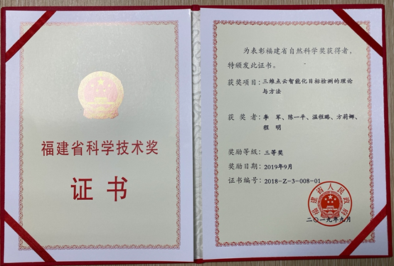 福建省智慧城市感知与计算重点实验室主任李军教授(第一完成人)、陈一平高级工程师、温程璐副教授、程明教授,获得2018年福建省自然科学三等奖,项目名称“三维点云智能化目标检测的理论与方法”。其他完成单位:福州大学。