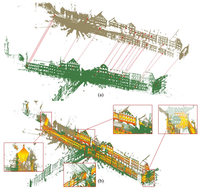 该论文提出了一种基于协方差描述子和博弈论的成对点云配准算法,用于解决三维激光扫描点云的配准问题。三维点云局部特征描述在三维目标识别与分类、点云语义分割、点云配准以及三维形状检索等应用中具有关键性作用,因此成为目前三维计算机视觉领域中一个新的研究热点,然而当前的点云局部特征描述主要采用几何信息构建描述向量,并没有充分利用三维激光点云的所有信息量(包含几何、颜色、强度信息等)。李军教授课题组研究提出新的基于协方差矩阵的特征融合方法来解决该问题,通过充分利用三维激光点云的信息量来构建特征描述,并利用协方差矩阵的统计特性来描述特征之间线性共性关系进行特征融合。该成果在鲁棒性以及抗噪性等方面超过了当前点云特征描述技术发展最新水平。另外,李军教授课题组还提出了一个有效的基于博弈论的对应点对提取算法,通过分析全局的对应点对几何约束关系,快速地剔除海量错误点对。该算法不仅简单而且有效,较大程度上提高了当前三维激光点云配准的精度以及鲁棒性能。