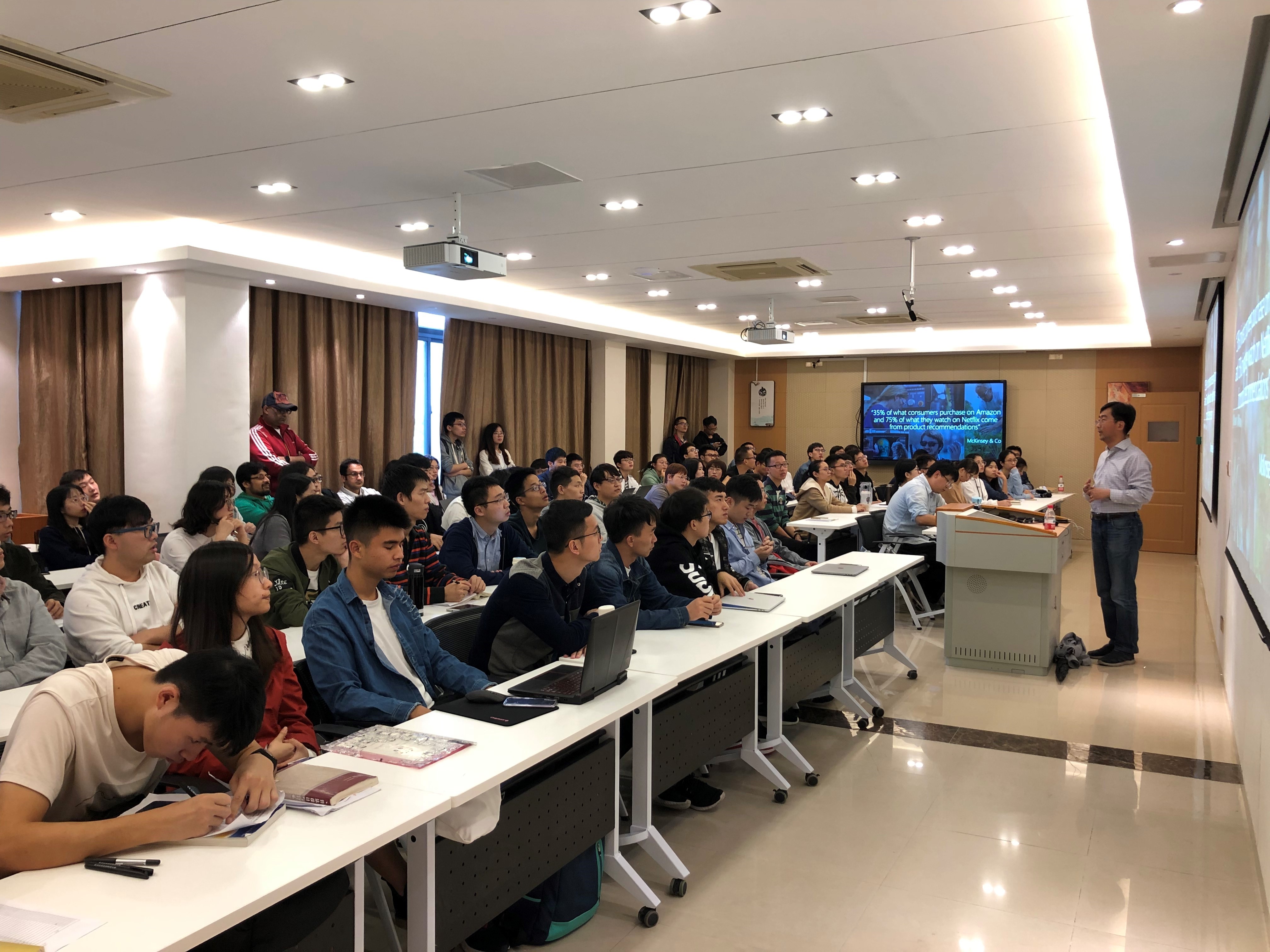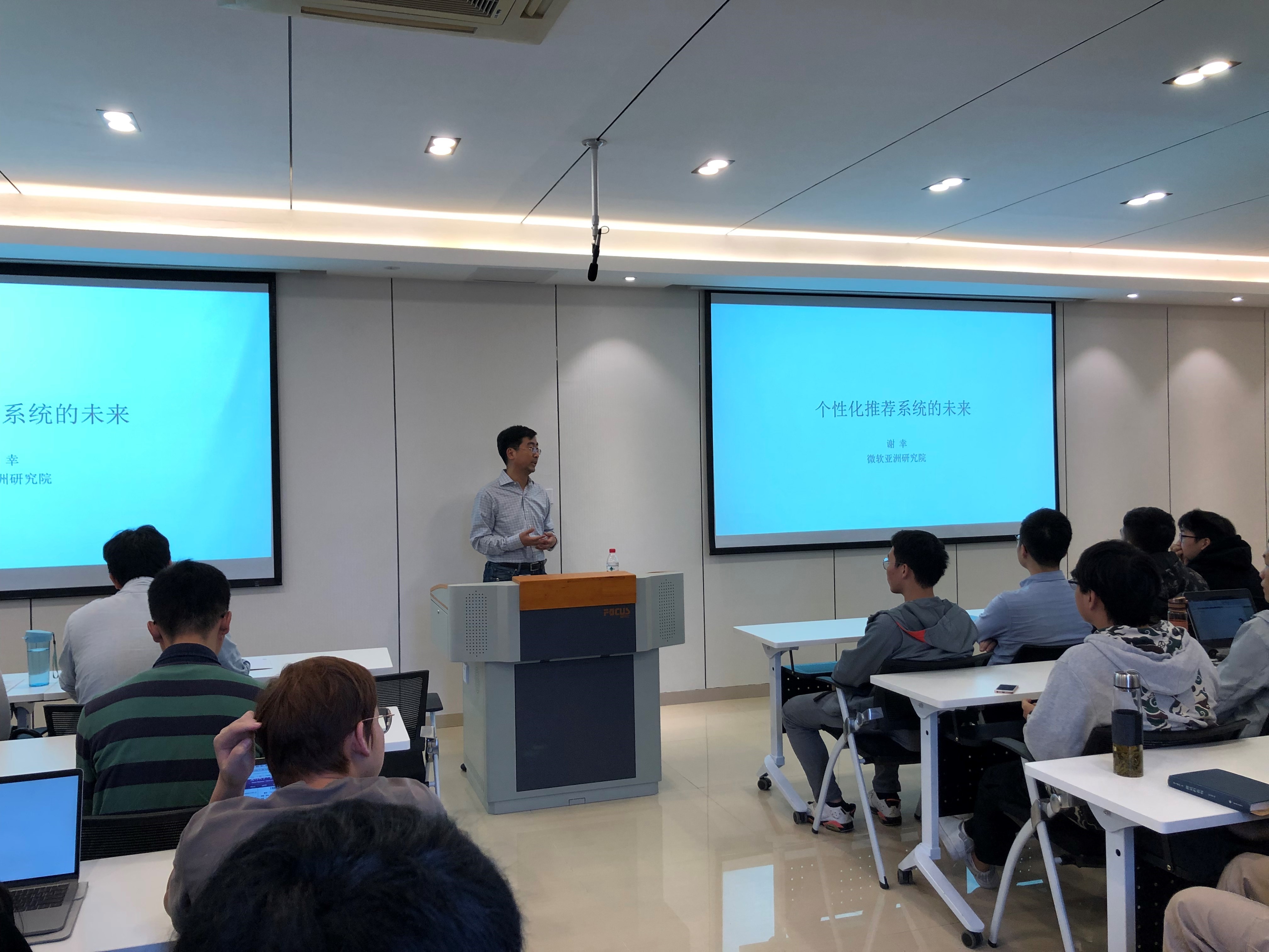 2018年11月26日下午,海韵讲座《个性化推荐系统的未来》在信息学院行政楼C510成功举办。本次讲座的主讲人为微软亚洲研究院首席研究员谢幸博士,主持人为本实验室助理教授陈龙彪博士,实验室及学院许多老师学生参加此次讲座,现场座无虚席。
