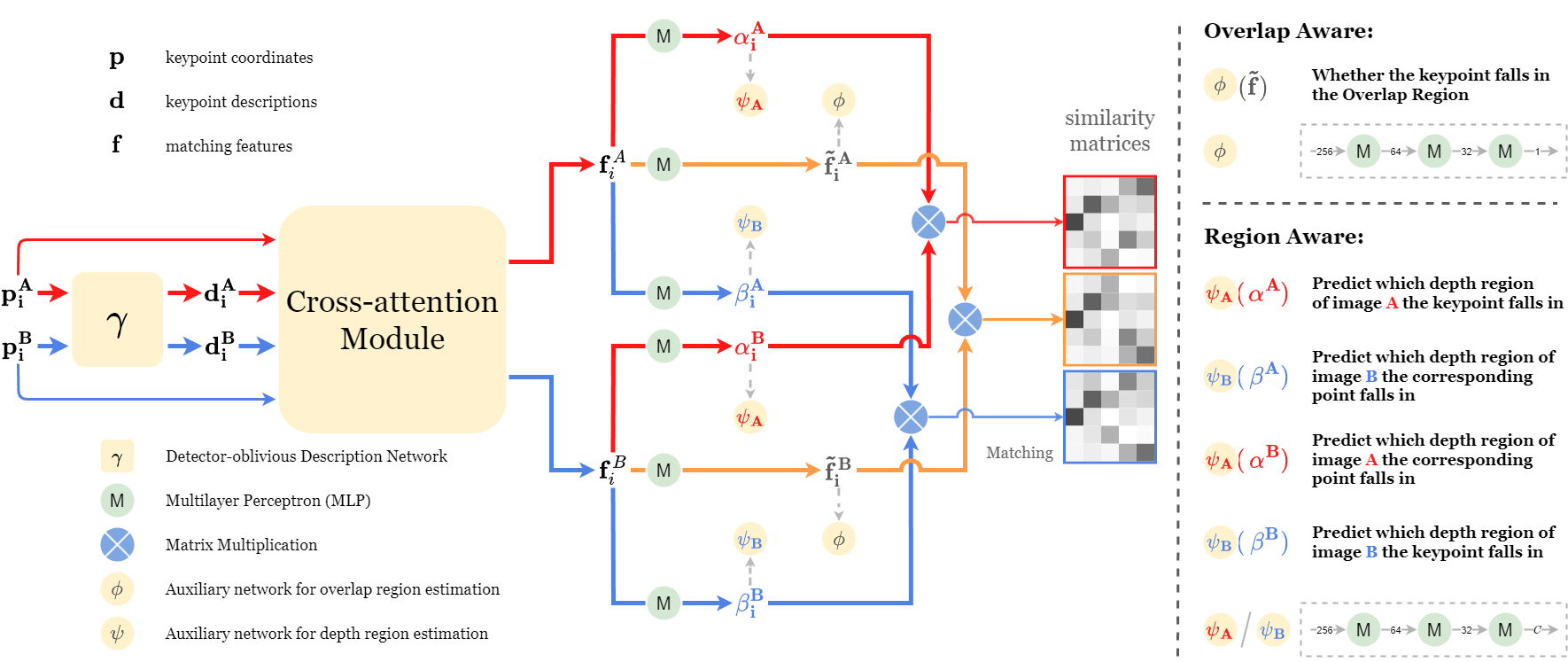 该论文提出了一个可用于任何关键点检测器的关键点匹配网络,并可以通过学习重叠区域和深度区域的对应性来提高匹配的性能。前人提出的关键点匹配网络,比如 SuperGlue,需要针对不同的关键点检测器进行重新训练,来适配检测器的特性。而本论文在经过实验发现和结构优化之后,提出了一种新的匹配网络。该网络在经过训练之后可以用在不同的关键点检测器中,不需要进行这一项耗时的重新训练过程。此外,该网络在训练过程中学习了重叠区域和深度区域的区域级对应关系。其一,重叠区域代表两张匹配图像的重叠区域。其二,深度区域代表两张图像中景物的前后景区域。本论文针对不同的区域级对应关系提出了划分方法、训练方法和损失函数,给匹配网络带来了显著的性能提升。