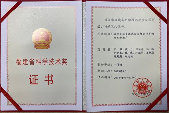 2019年10月14日,福建省人民政府公布了关于2018年度福建省科学技术奖励的决定。福建省智慧城市感知与计算重点实验室常务副主任王程教授(第一完成人)、范晓亮高工、臧彧副教授、陈龙彪助理教授,获得2018年福建省科技进步一等奖,项目名称“城市交通多源感知与智能计算的研究和推广”。联合申报单位包括福州大学、厦门卫星定位应用股份有限公司、中国科学院地理科学与资源实验室、长威信息科技发展股份有限公司。